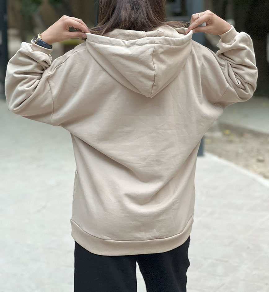 هودی یقه اسکی جیب بغل با قد ۷۲ سانتیمتر برای جلو و پشت، عرض ۱۱۸ و دور بازوی ۵۴ سانتیمتر، فرم آزاد و بسیار راحتی دارد. یقه اسکی بلند باعث میشود در هوای سرد گردن گرم بماند و پارچه توکرکی دو نخ حس لطافت و گرمای مناسبی ایجاد میکند.